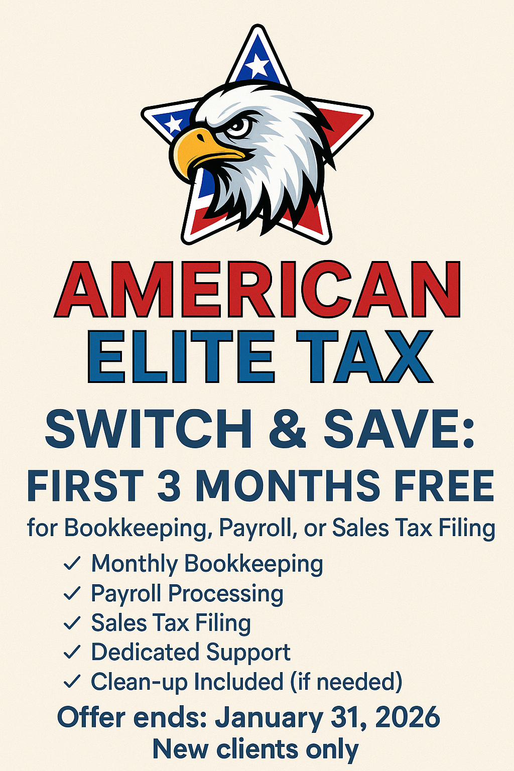 If you are paying too much for bookkeeping, payroll, or sales tax filing, or you feel you are not getting the support you need, this is the perfect time to switch to American Elite Tax.